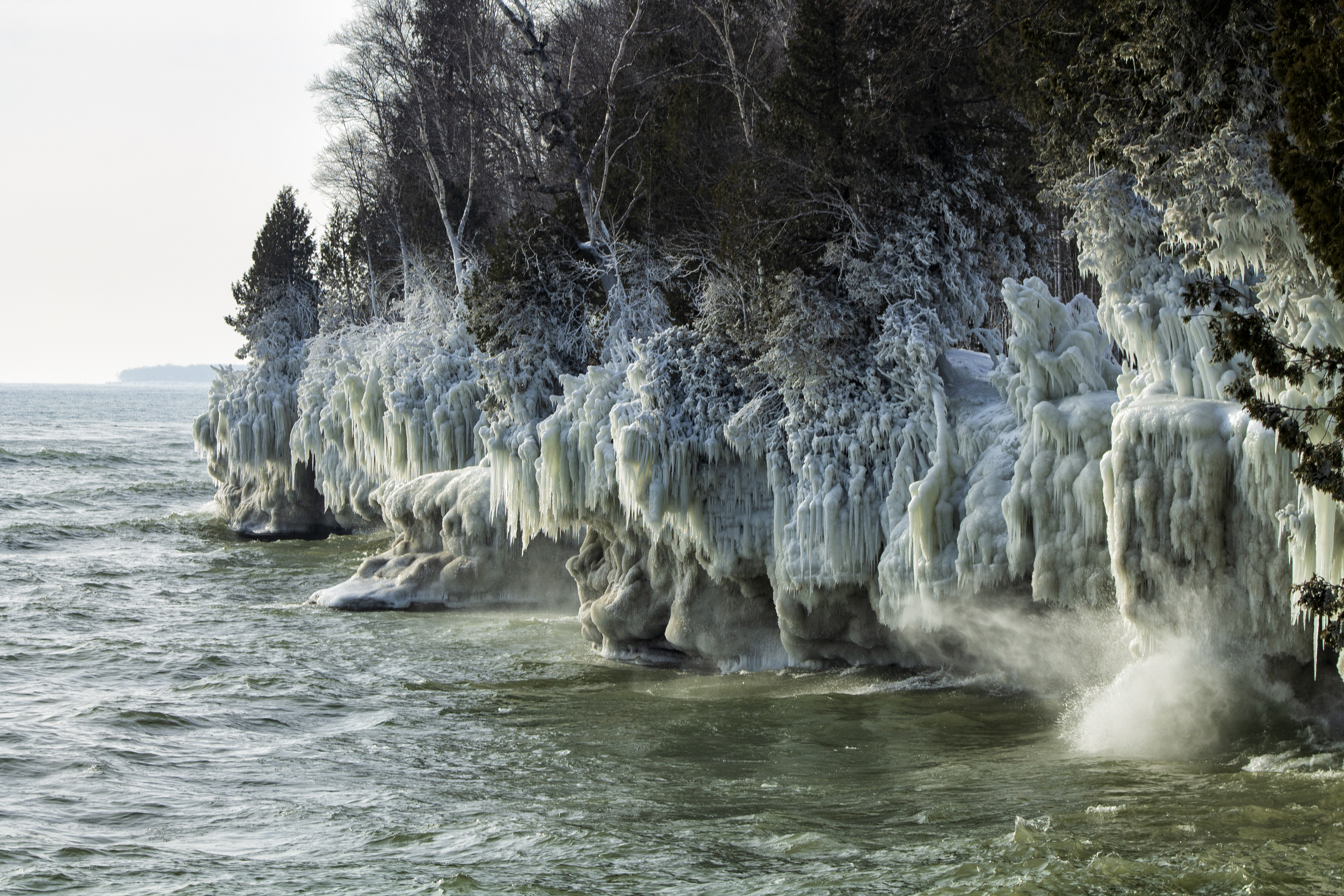 The trees near the shore become beautiful hosts for icicles. I saw the ice on trees right on the shore to all the way back 15-20 feet. I’d imagine the high winds during the vortex caused the icy art on the trees farther inland.